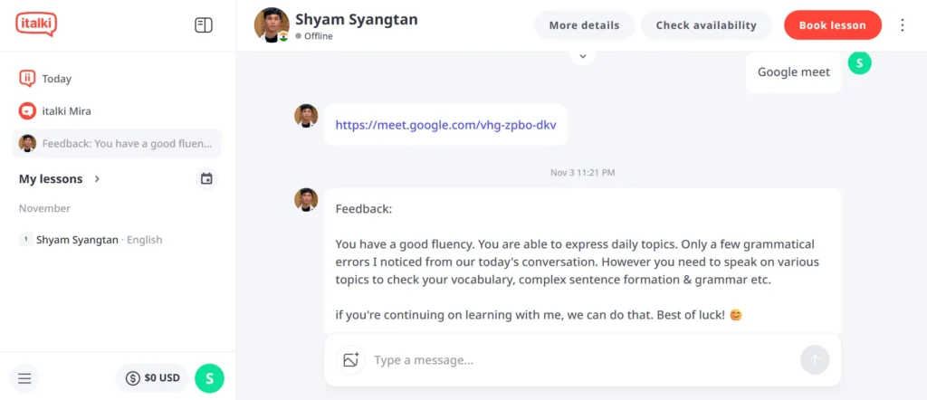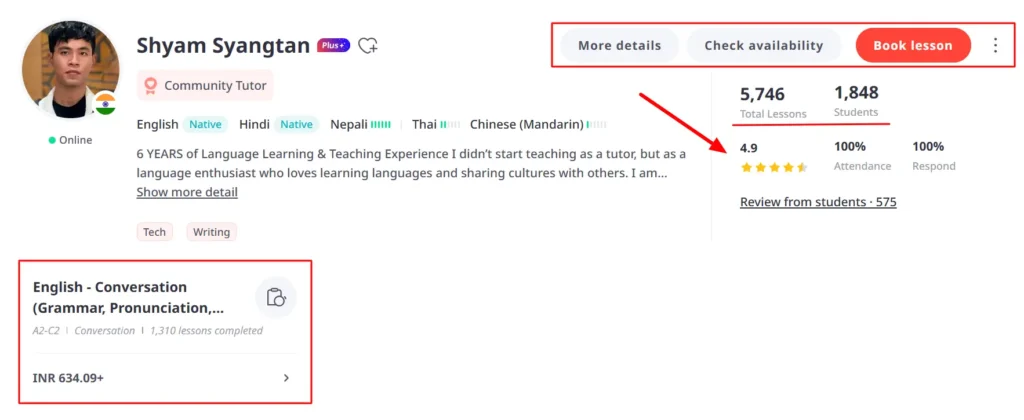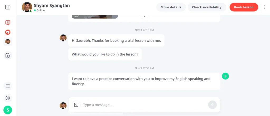 Based on all that, I picked an Indian tutor named Shyam Syangtan for my English fluency practice session. He had trial slots available the same evening — perfect timing after my dinner.