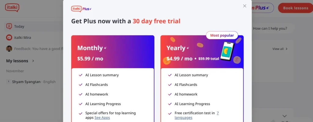 There’s no mandatory subscription — you pay per lesson, and an optional iTalki Plus plan (about $5–$6/month) adds extra AI learning features.